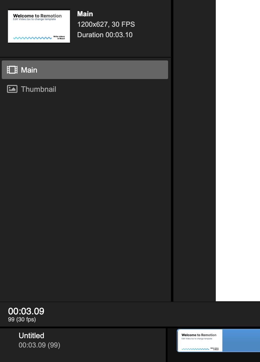 This template contains only the bare minimum Remotion boilerplate and a completely empty canvas. It is especially useful for people already familiar with Remotion who would like to skip deleting the Hello World project every time.